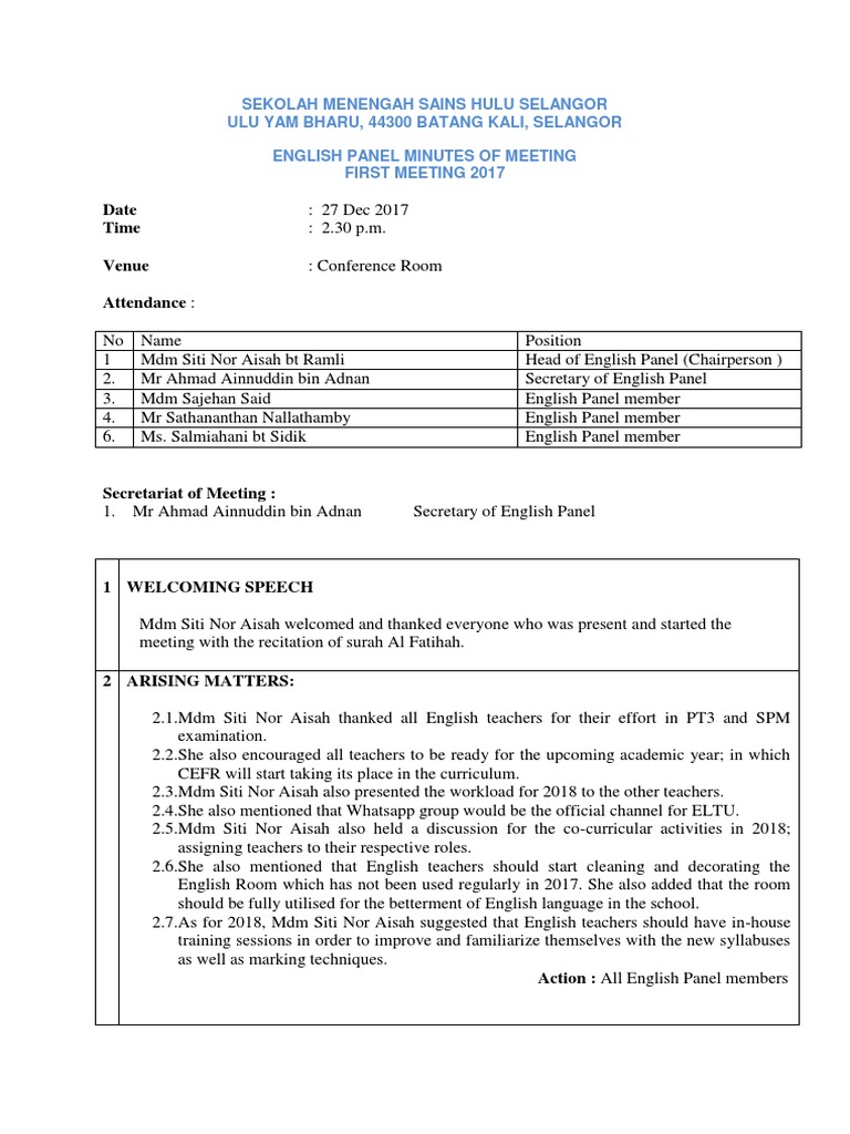 Semak format penulisan yang terbaik untuk memastikan perjalan pengurusan sekolah berjalan dengan lancar, mesyuarat perlu dilakukan. Technical committee on metals and ores. Minit mesyuarat bahasa inggeris bil 1 2018.doc. Ia juga merupakan bukti yang kuat kepada sesuatu perkara itu ada dibincangkan. Contoh minit mesyuarat format minit mesyuarat terkini mp3 & mp4.